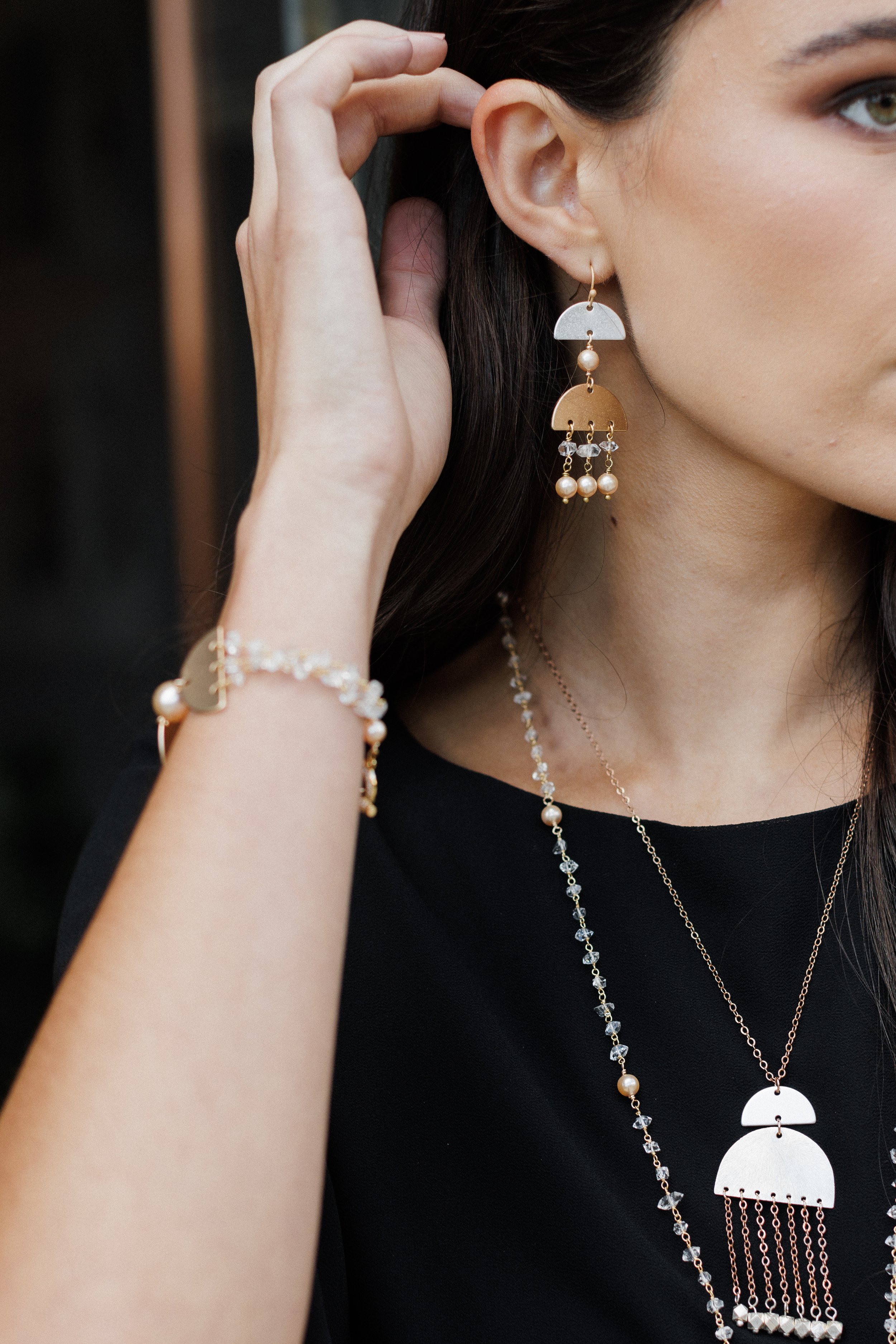 Each piece echoes the language of design — clean lines, striking contrasts, and harmonious geometry — transforming jewelry into wearable architecture. Neutral hues keep every creation versatile and polished, while the fusion of metals brings playful sophistication, allowing Mistura to transition effortlessly from daytime elegance to the dynamism of city nightlife.